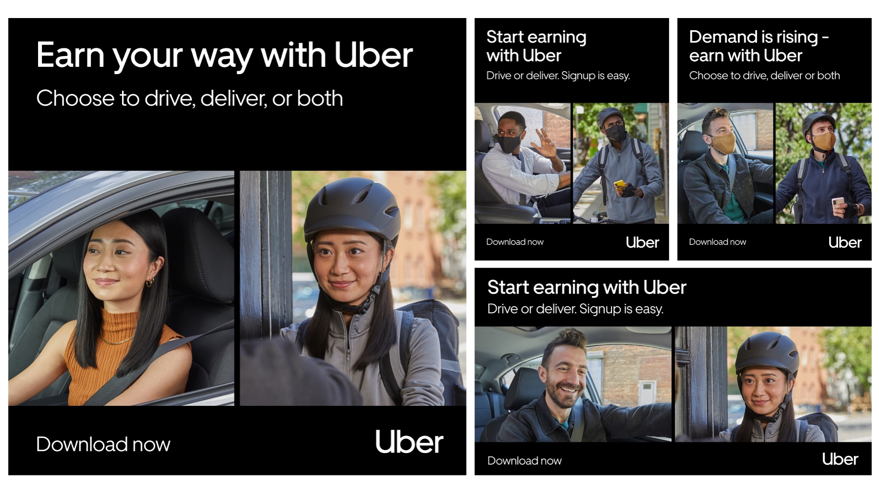 Uber requested new creative templates for an acquisition campaign, targeting potential driving and courier partners in the US, Canada, & Mexico. Our goal was to communicate that Uber offers multiple ways to earn, inviting the audience to sign up to drive and/or deliver through the Uber app.