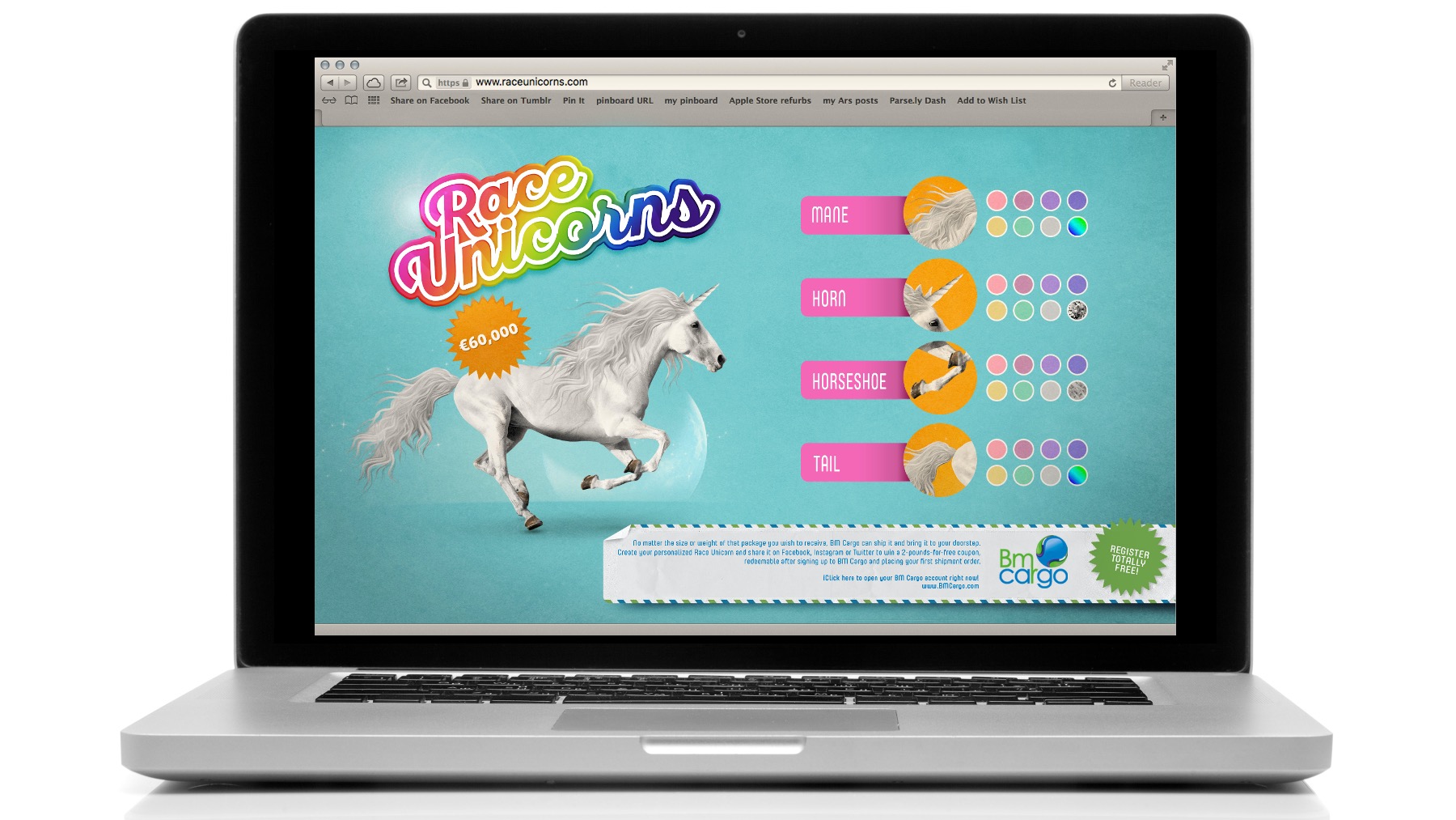 Although the e-commerce element of our campaign was fictional, the interactive websites functioned as a promotional platform, social media amplification tool, and database builder. Visitors could play with our entertaining product customization menu to create their orders of pimped tanks and track-ready unicorns, those who shared their final product on their social profiles entered a giveaway to win discounts in their first shipment order with BM Cargo.